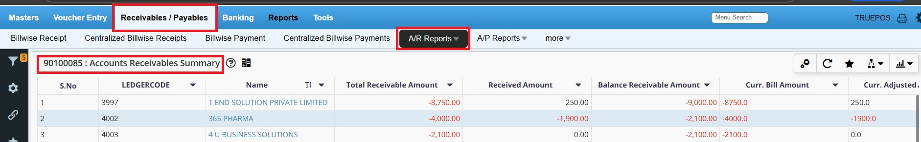 The Accounts Receivable Summary report displays the customer wise receivable summary.