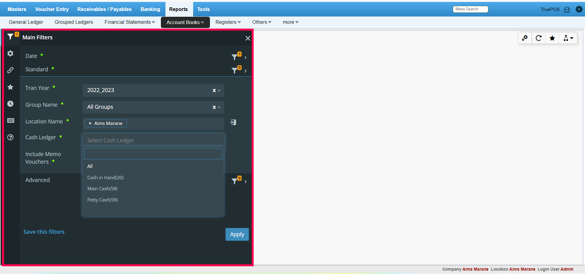 Step 3: Add the specific filter information, including the transaction year, group information, location name and Cash ledger.
