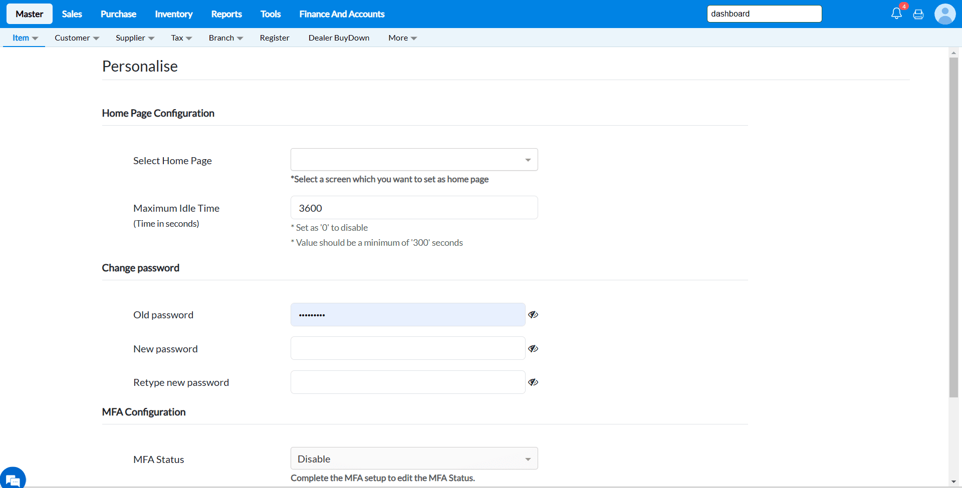 On the Personalise screen, locate the Change Password section.