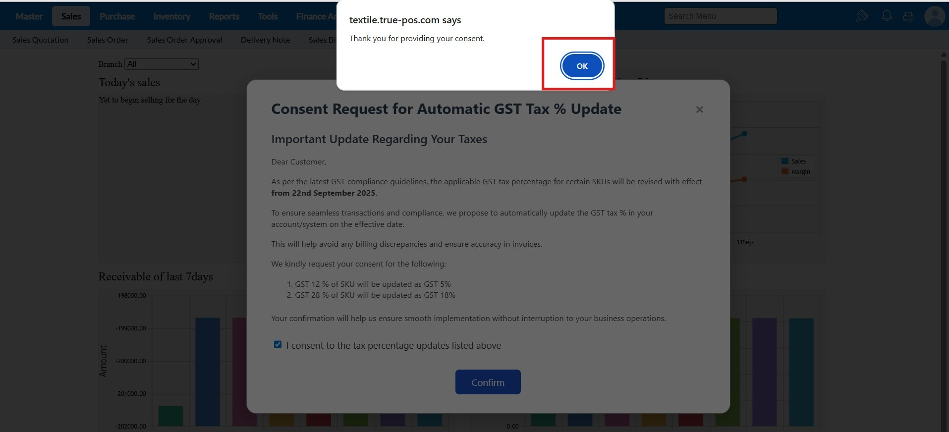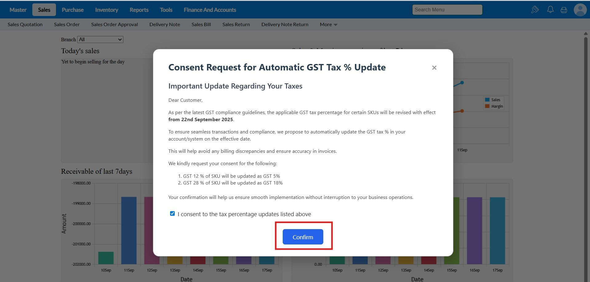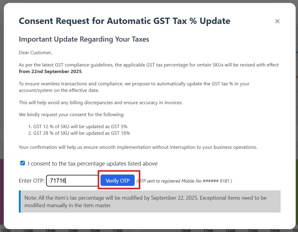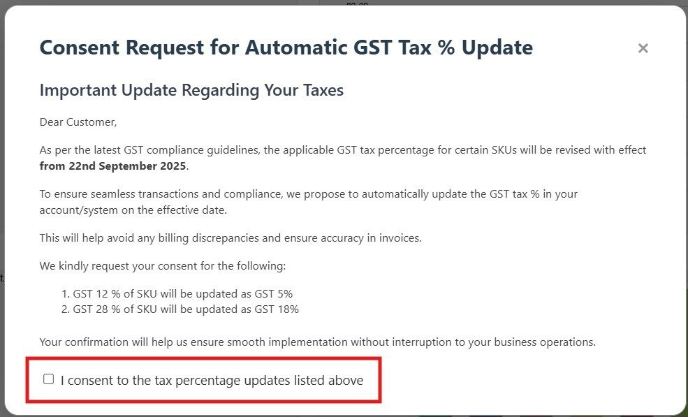 The tax% for the products will not update automatically on September 22nd 2025. You can update on the immediate basis by clicking the 'Profile → GST Consent' and follow the above process. So that the reverted tax details will be updated to all products once confirmation done.
