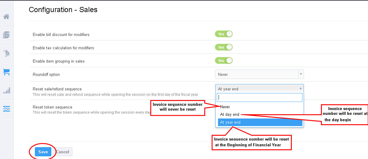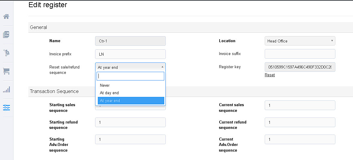 The Invoice Sequence can be changed at the beginning of the financial year or at the beginning of the day for Sales, Refund and Advance order.