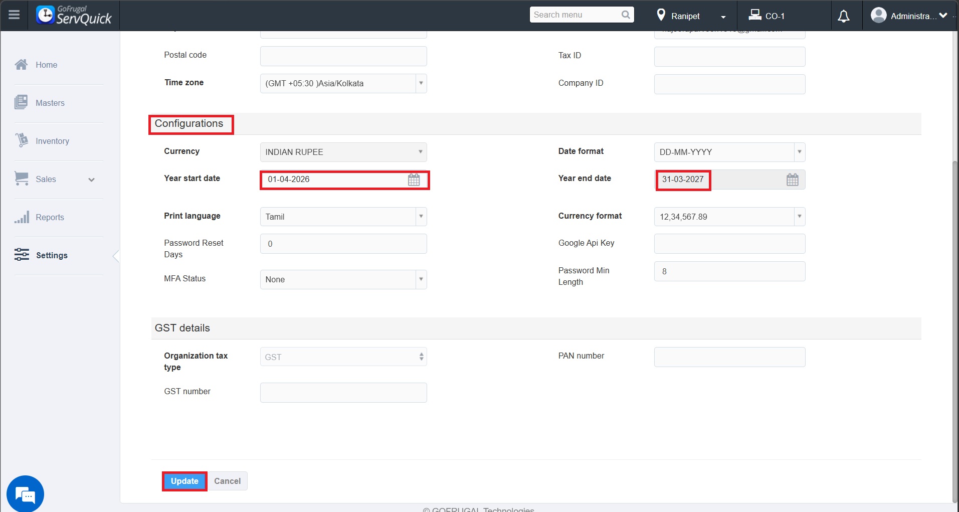 Financial Year Begin month could be set by going to Settings -> Company Info. Click on Update to save the changes made.