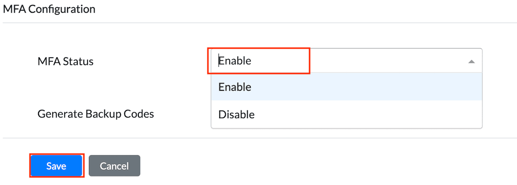 3.When the user Disabled the MFA, the user will have Enable MFA option in MFA Configuration. On clicking 'Enable' the MFA settings screen is routed.