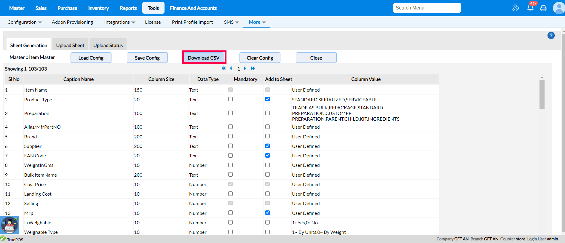 Select Item Master from the Sheet Generation tab, enable the fields based on your requirement, and download the CSV file.