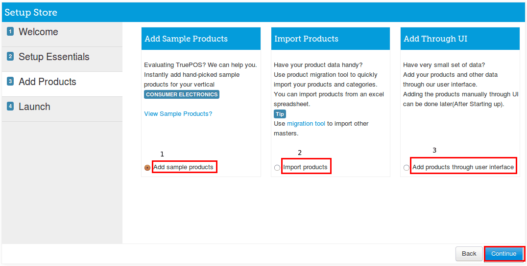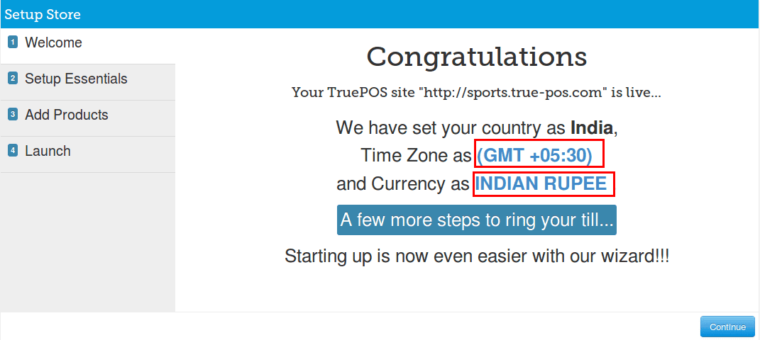 The Setup Wizard in TruePOS guides users through the initial configuration process, ensuring a smooth setup that enables quick and accurate billing. It helps businesses tailor their TruePOS domain to their specific requirements, including time zone, currency, taxes, payment methods, and product management.