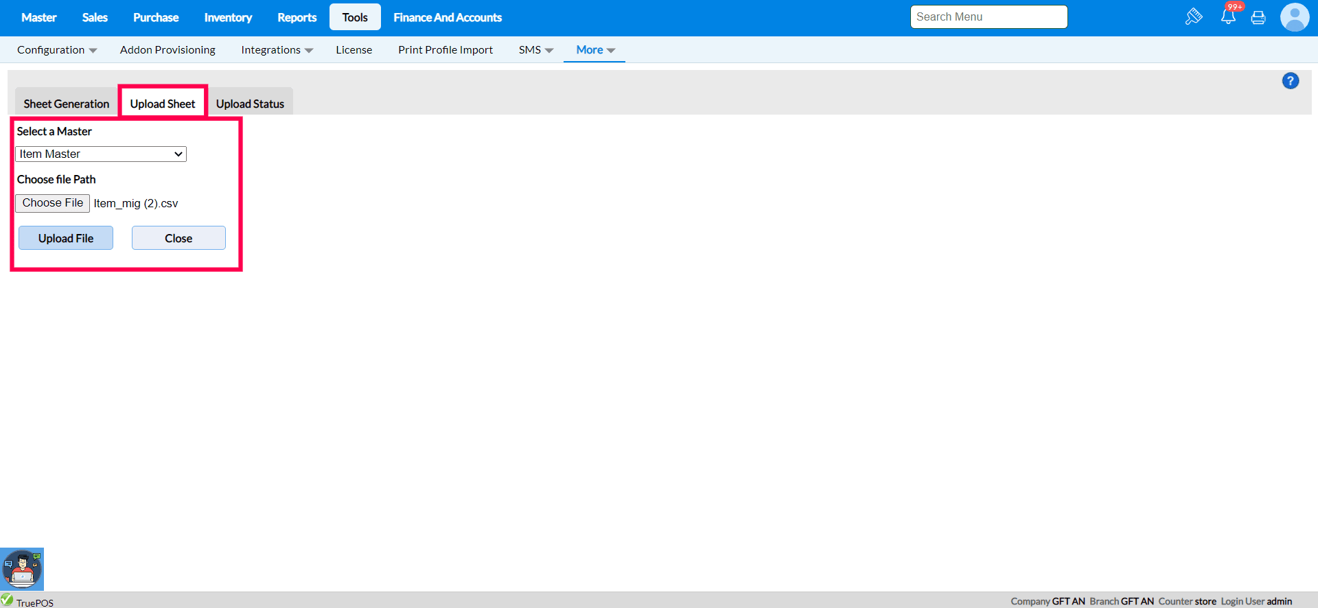 In the Upload Sheet option, select Master File Data and click Upload File.
