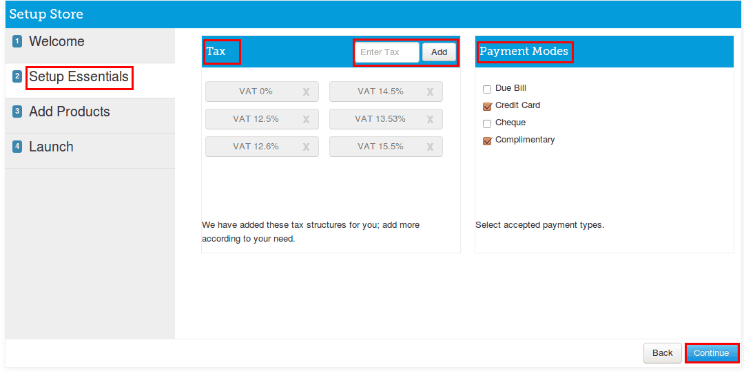 Set up essentials - The Setup Wizard displays the commonly used taxes and payment modes.