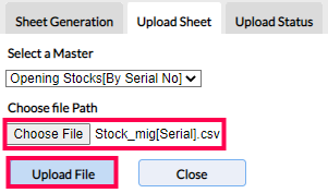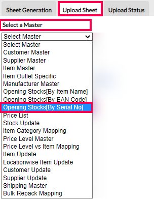 Step 7: In the Upload Sheet screen, from the drop-down of the Select a Master field, select Opening Stocks [By Serial No]