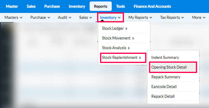 Step 2: From the drop-down of the Inventory section, select Stock Replenishment > Opening Stock Detail