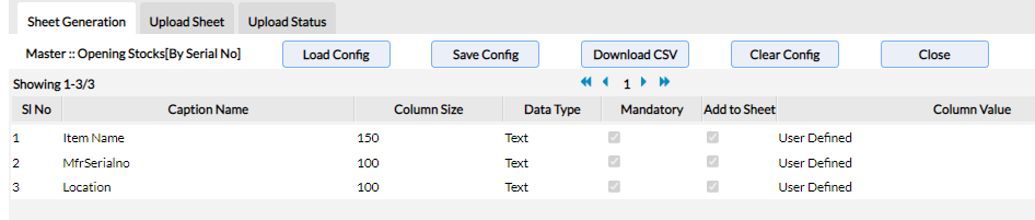 Step 2: In the Sheet generation section, from the drop-down of the Select a Master field, select Opening Stocks [By Serial No] and click on Load Config