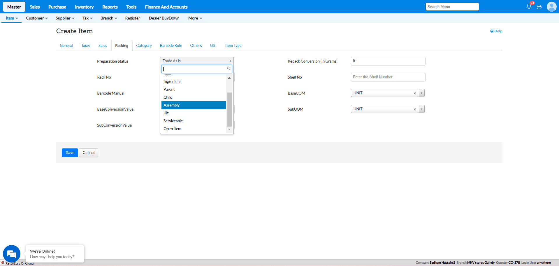 Note: Adding an Assembly item involves a three-step process. After creating the Assembly item and its components, configure the preparation details under the "Assembly" category.