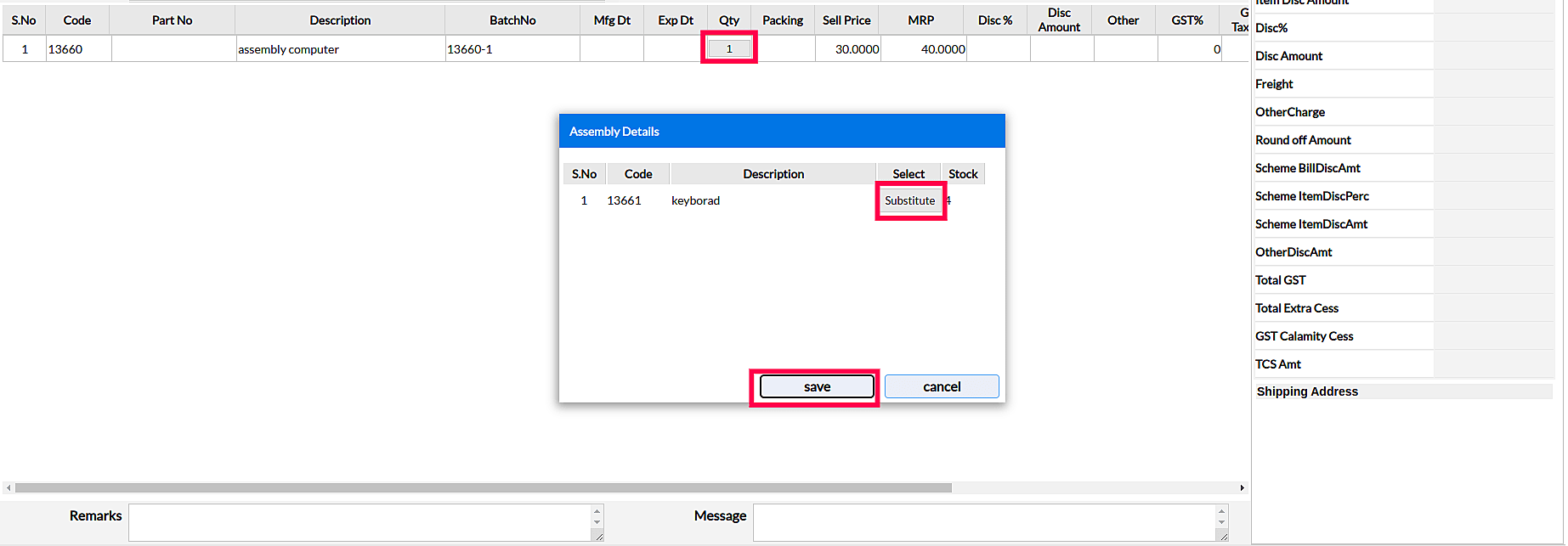 Answer: If an ingredient's stock is insufficient, the system will notify you. You can either select a substitute ingredient or reduce the Assembly quantity in the sales bill.
