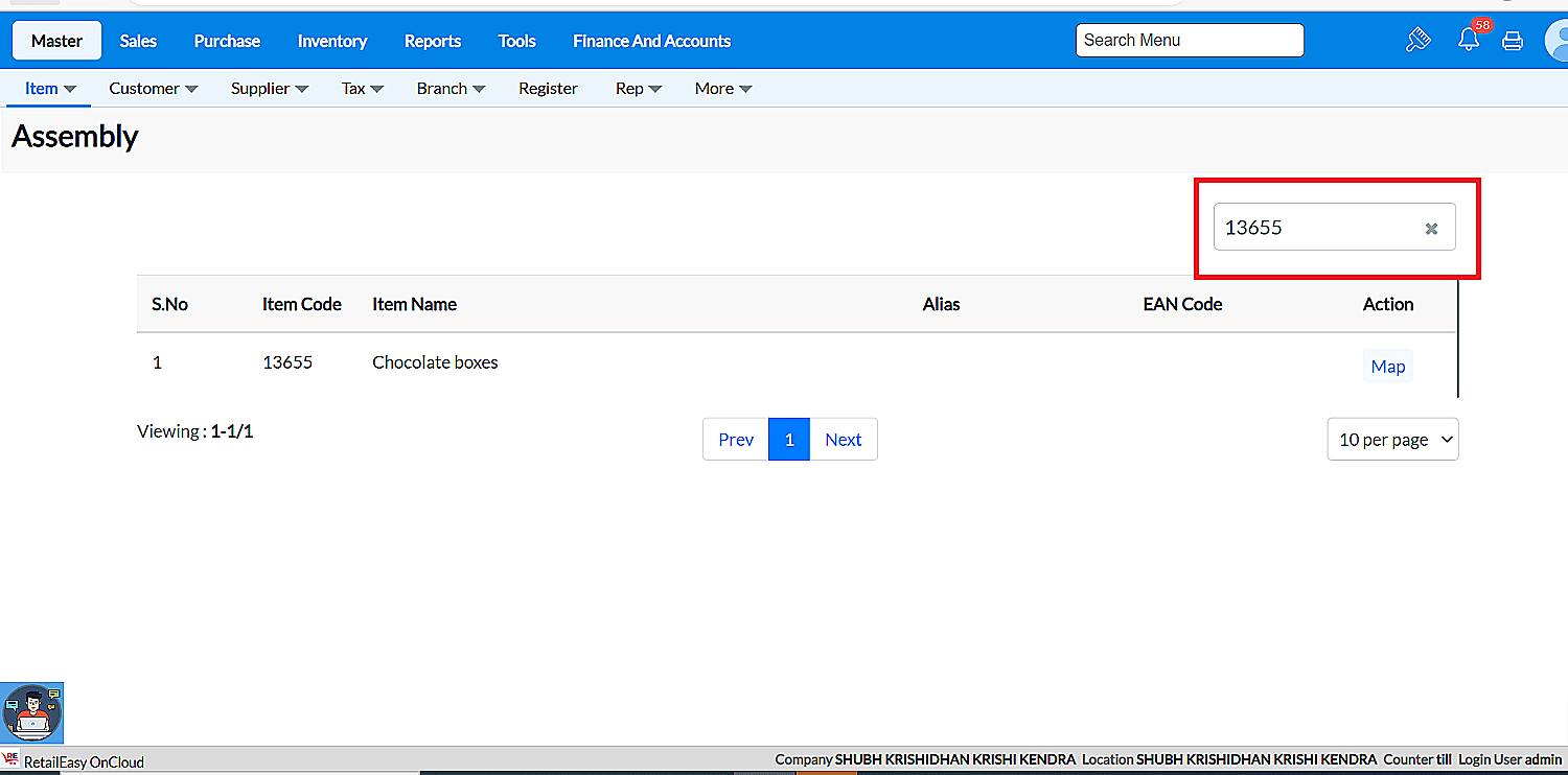 Locate the created Assembly item by searching with the Item Code in the Assembly Mapping screen.