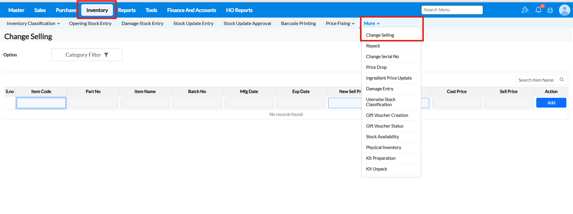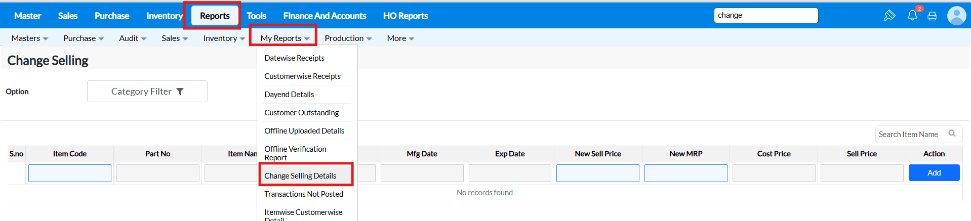 Change selling facilitates to change the selling price and MRP of the items. The selling price of the products will change more often in accordance with market change. Especially, the prices of the items in supermarkets and grocery stores will always be changing overnight. Using Change Selling screen, You can load the items and change the selling price and mrp in a minute.