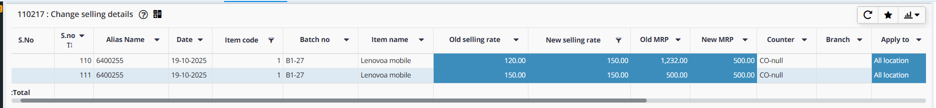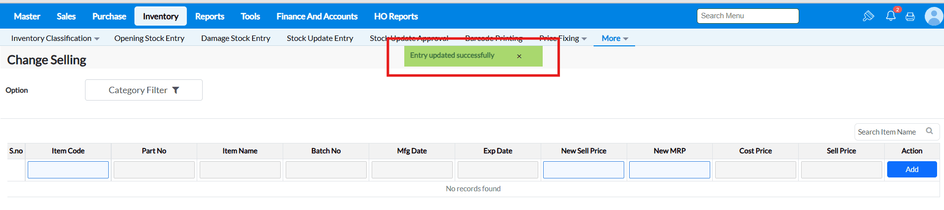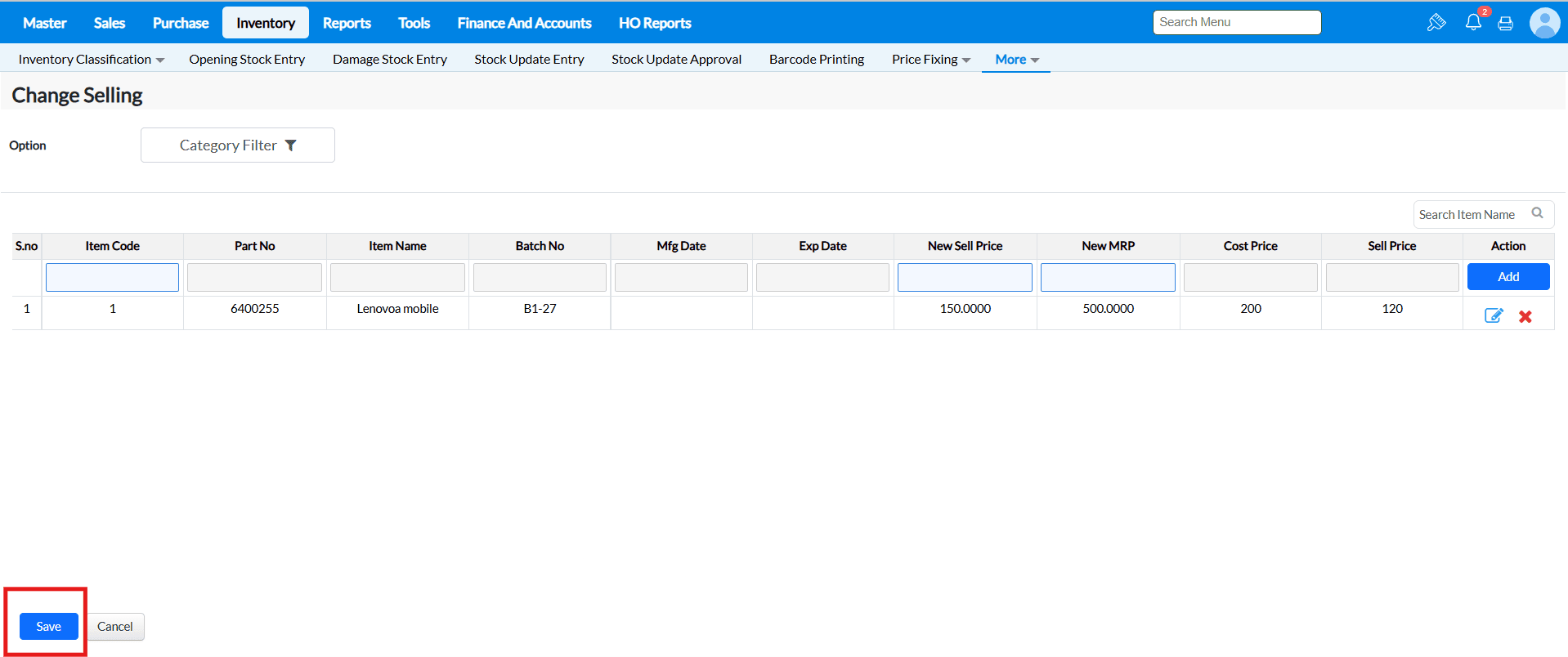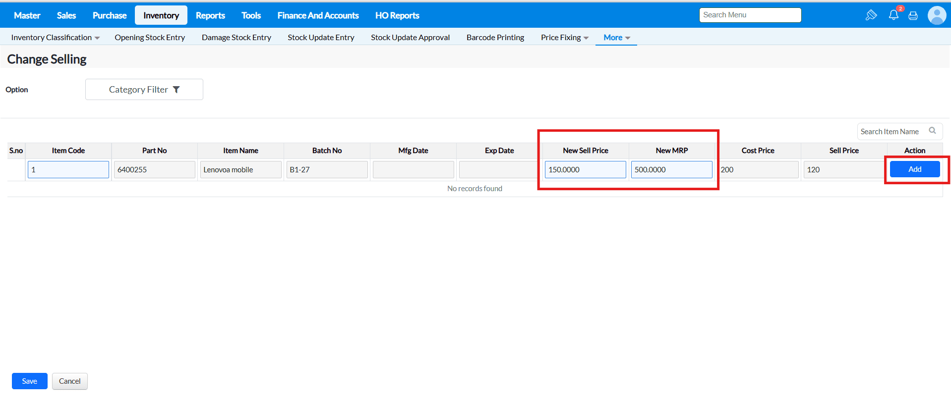 3. After selecting the item enter the new price details at Selling and MRP fields and press 'Add'.