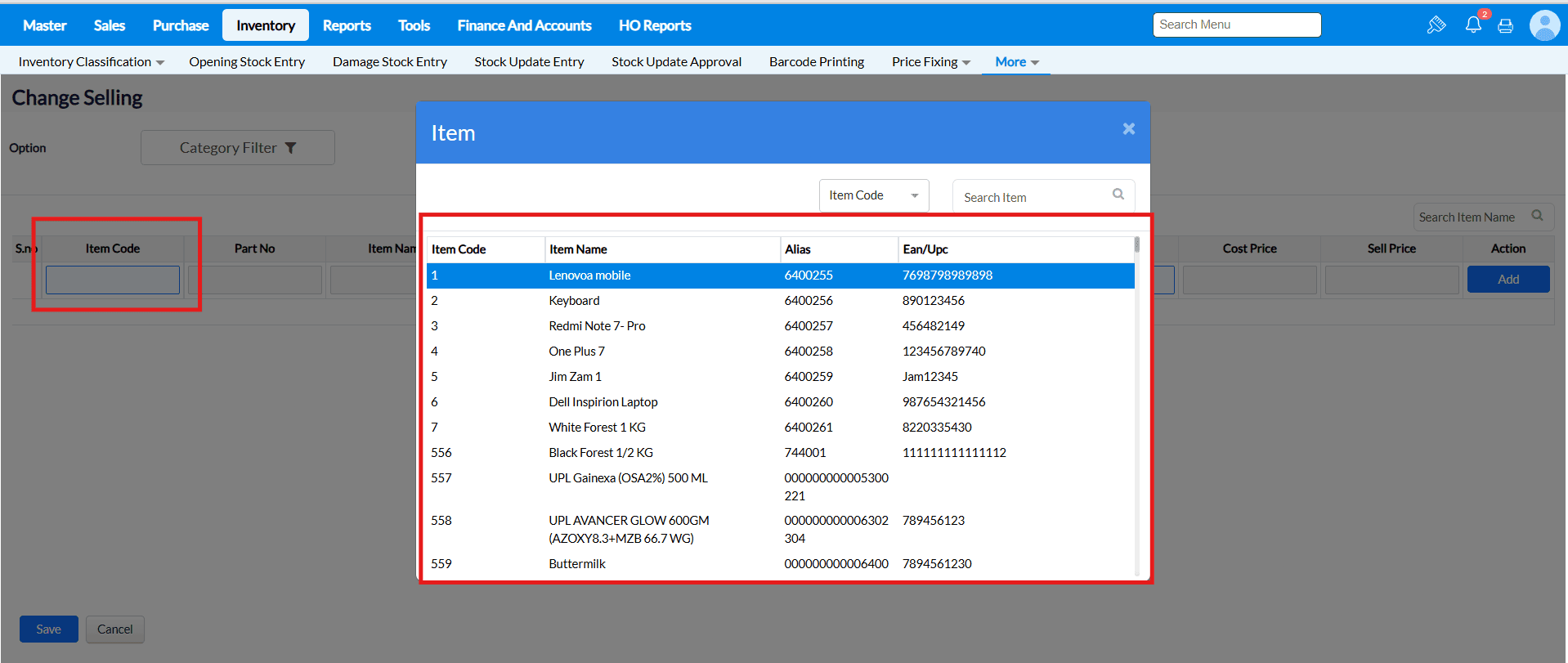 2. After routing to the menu, press enter by keeping the cursor in Item Code so that the item list will be displayed and select the respective item for which the price details should be change.