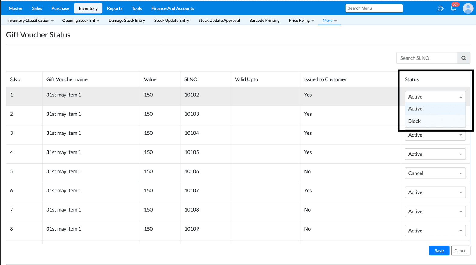4. If voucher serial is issued to customer then we can change status only to Block it. If voucher serial is not issued to customer then we can change status to Cancel only.