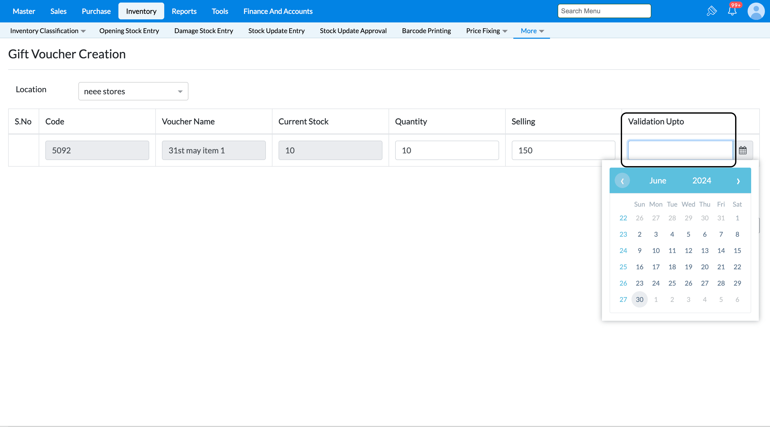 9. You can set expiry date for voucher by clicking on Validation upto field and choosing the expiry date.