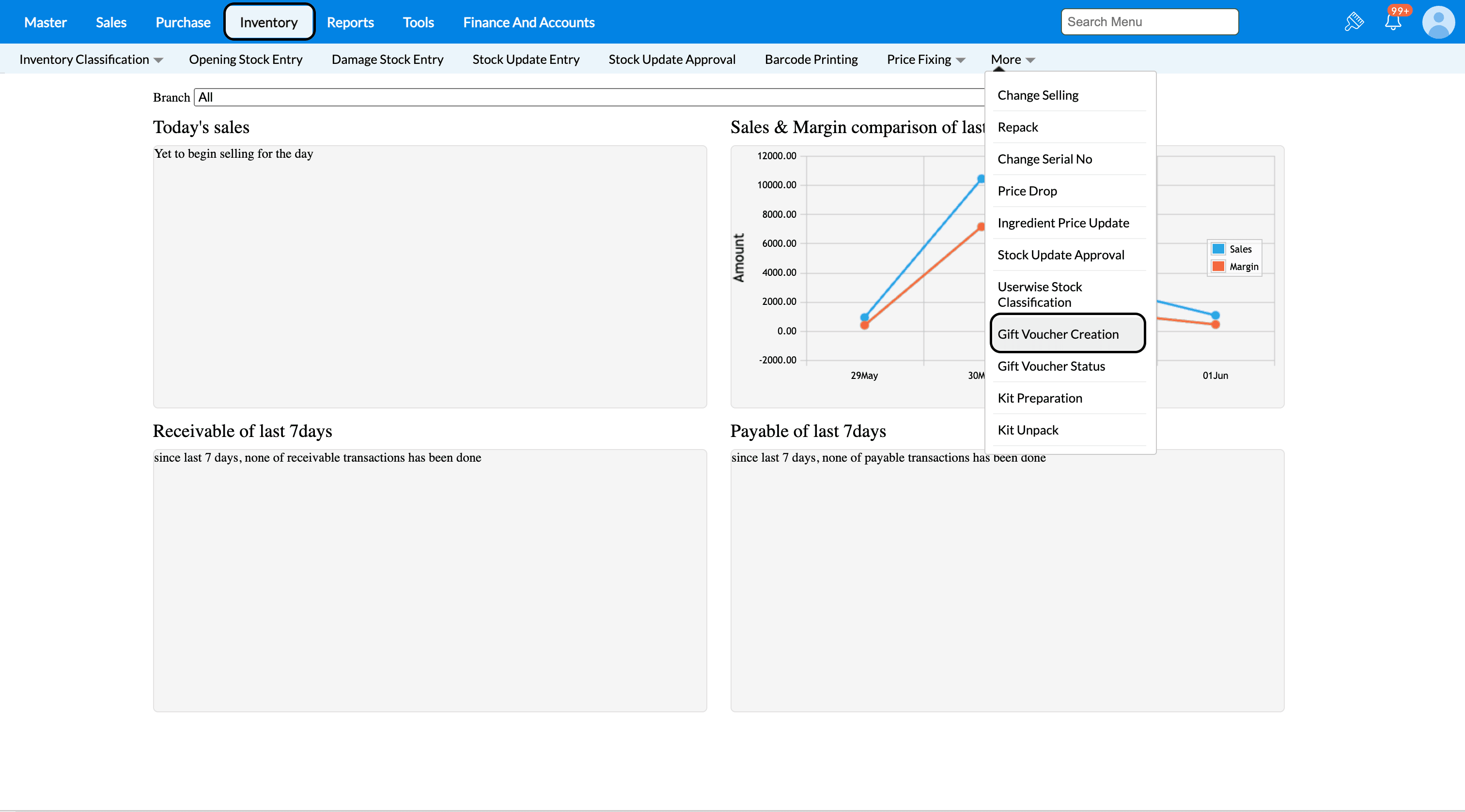 1. From the Dashboard, Go to Inventory → Gift Voucher creation.