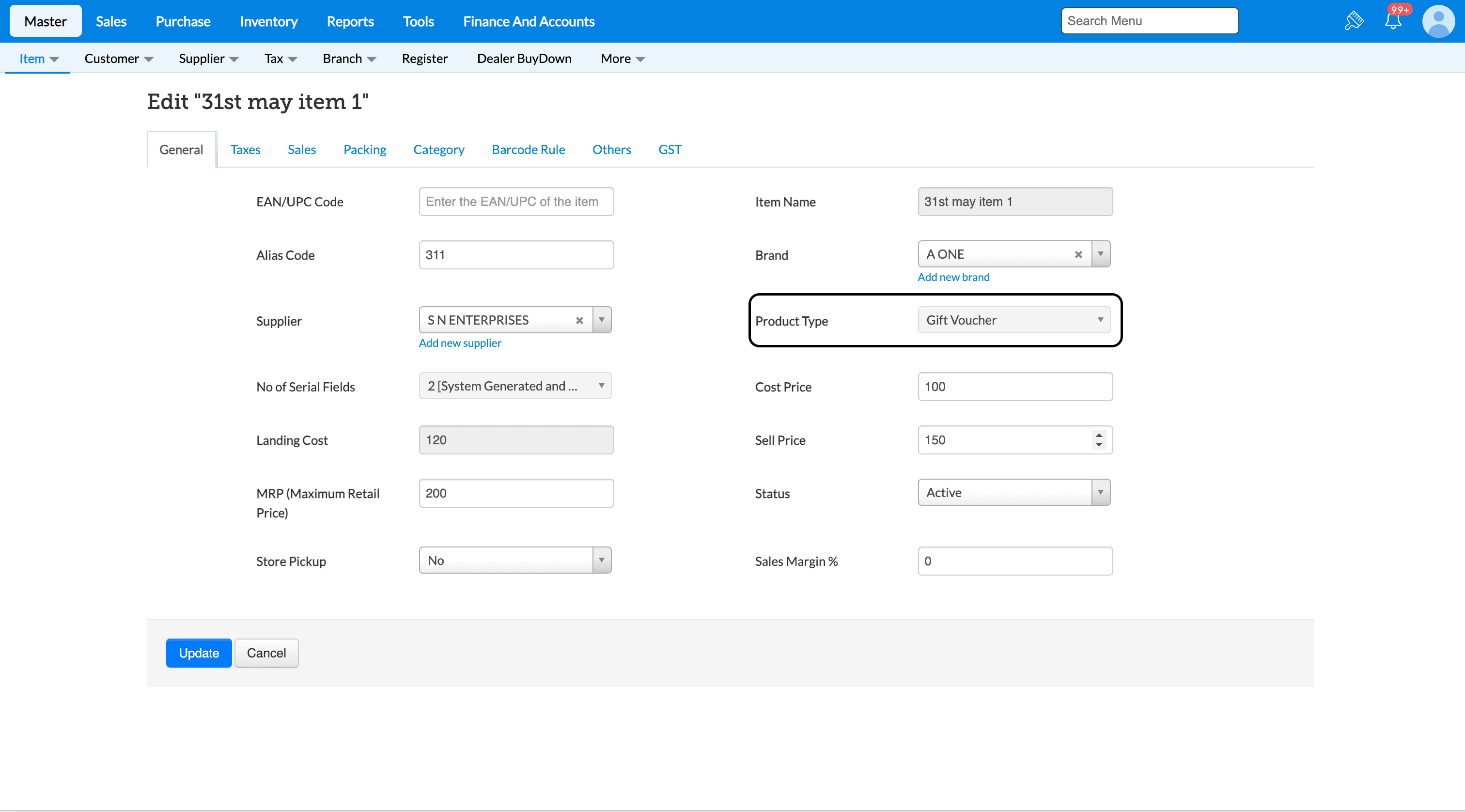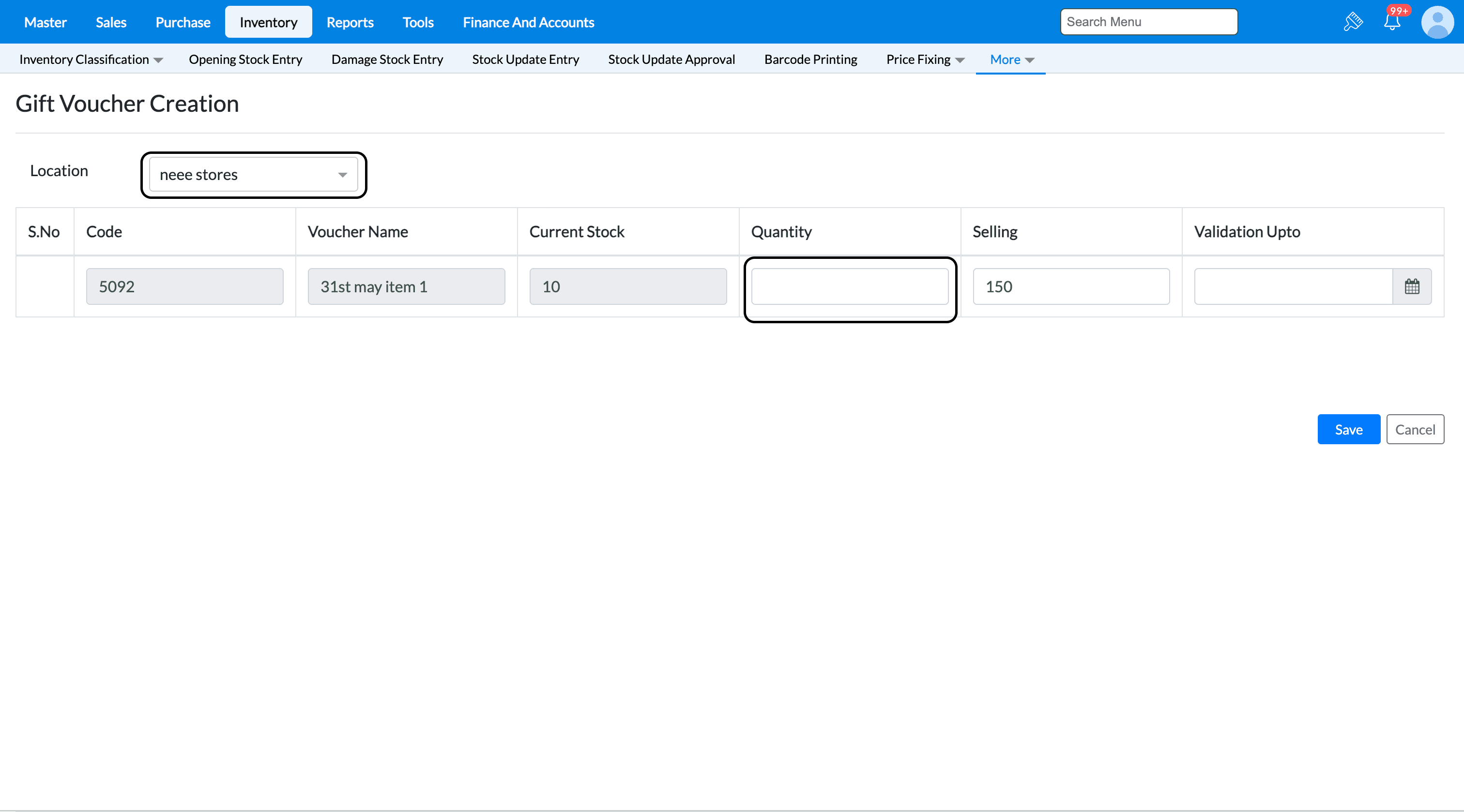 10. Click Save to create inward for the Gift Voucher Item.