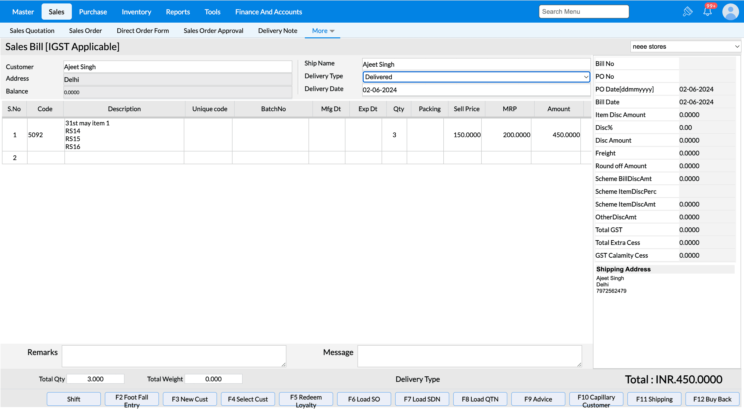 1. From the Dashboard, Go to Sales → Sales Bill.