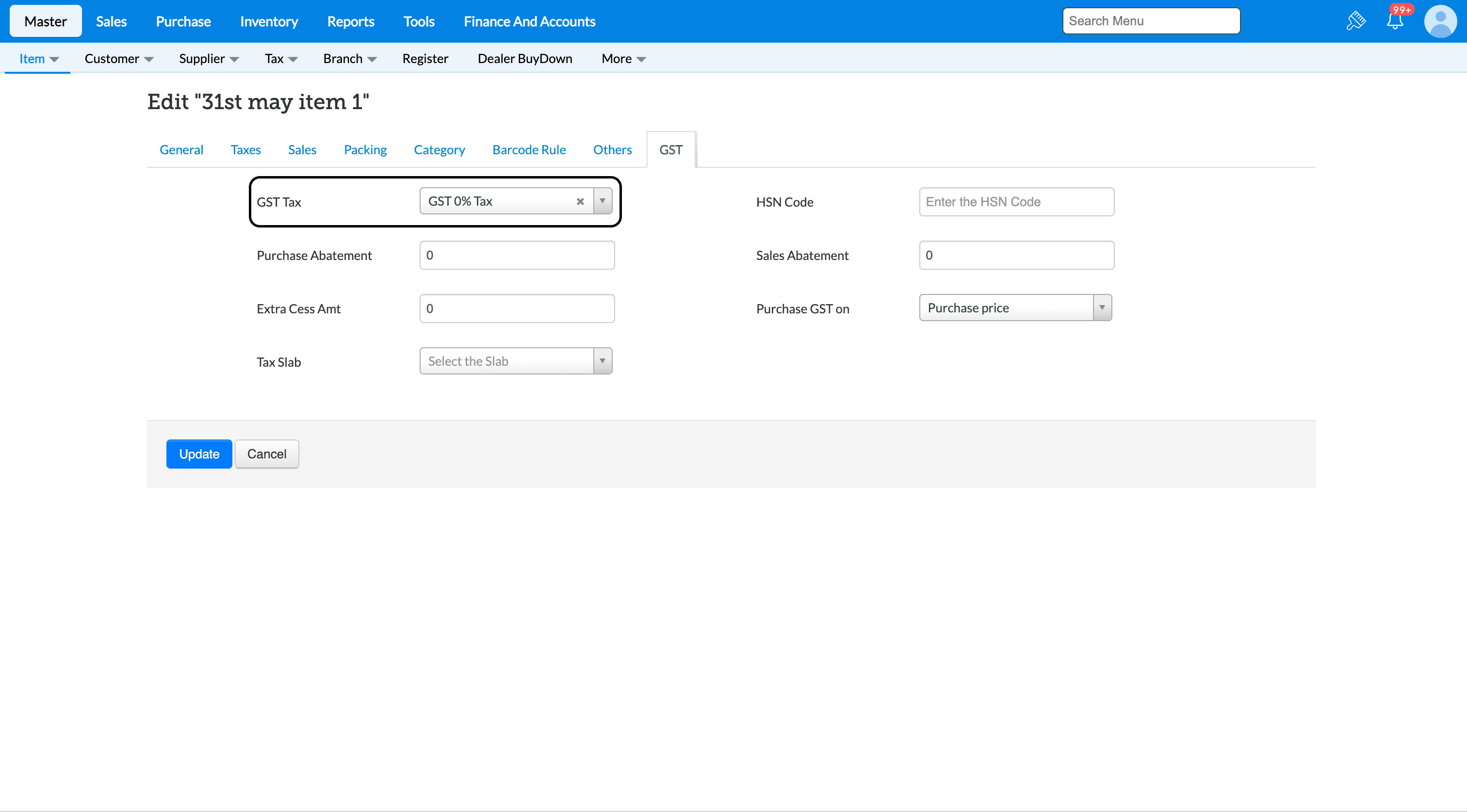 2. Ensure the GST tax % is given as 0(Zero).