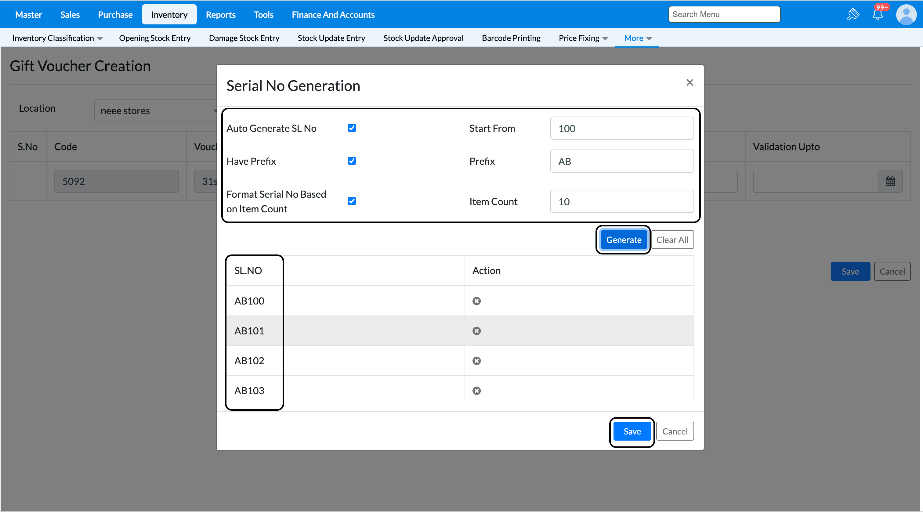 * Ex., Give "100" in serial number and enter "10" in the Item count field. Once the generate button is clicked, serial numbers will load in format of 100, 101, 102, 103, 104, 105, 106, 107, 108, 109.