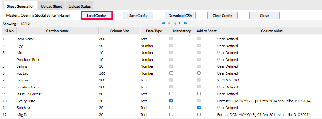 RetailEasy on-cloud lets you customize/configure the template sheet through the Load Config button