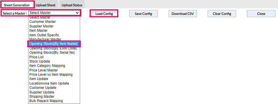 Step 2: In the Sheet generation section, from the drop-down of the Select a Master field, select Opening Stocks [By Item Name] and click on Load Config