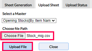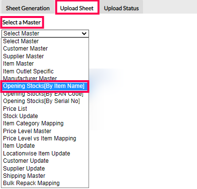 Step 7: In the Upload Sheet screen, from the drop-down of the Select a Master field, select Opening Stocks [By Item Name]