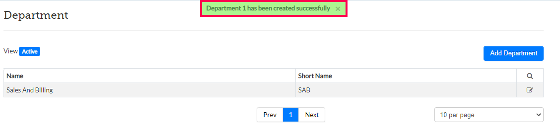 Step 5: A message confirming the successful addition of the Department appears