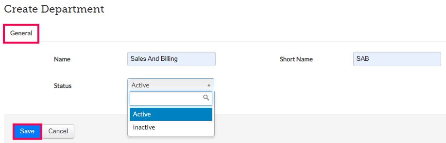 Step 4: In the Create Department screen, fill in the fields of the General section and click on Save