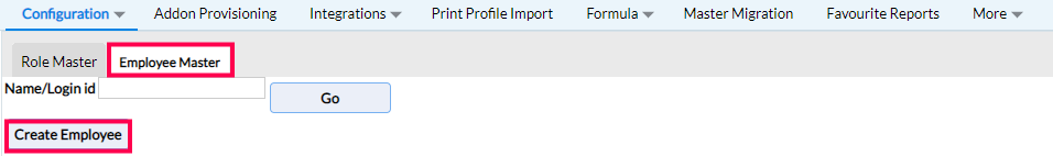 Step 3: In the Security Configurations screen, switch to the Employee Master tab and click on Create Employee