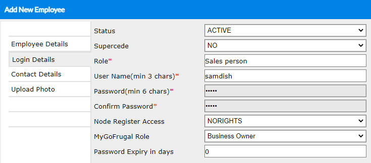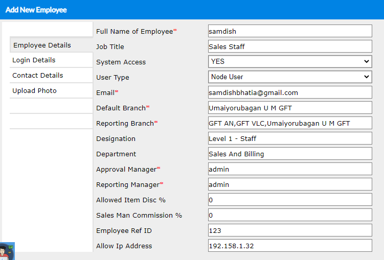 Thus your Employee has been successfully added to the domain with a clearly defined node register, menu access permissions and login credentials.