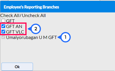 Default Branch, Reporting Branch - The Default Branch that the User logs in to. The Reporting Branches are all those Branches that the User has access to. Only one mandatory Branch can be set as the Default Branch. There are no restrictions in adding the reporting branch