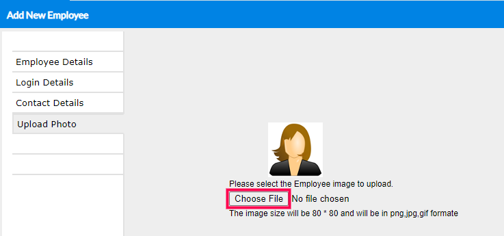 Step 7: In the Upload Photo section you can add the photo of the employee. Click on Choose File and select the file from your system's storage