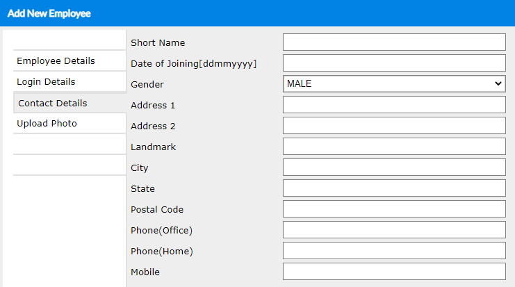 Step 6: In the Contact Details section, enter the contact details of the Employee, like Short Name, Date of Joining, Gender, Address, Phone number, etc.