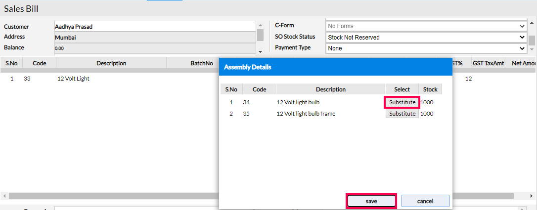 In the Sales Bill screen, if the Assembly Item (light bulb) is added to the bill, the Assembly Details pop-up appears with the Item Code, Description, Stock and Select option. Click on Save if no modifications are required.