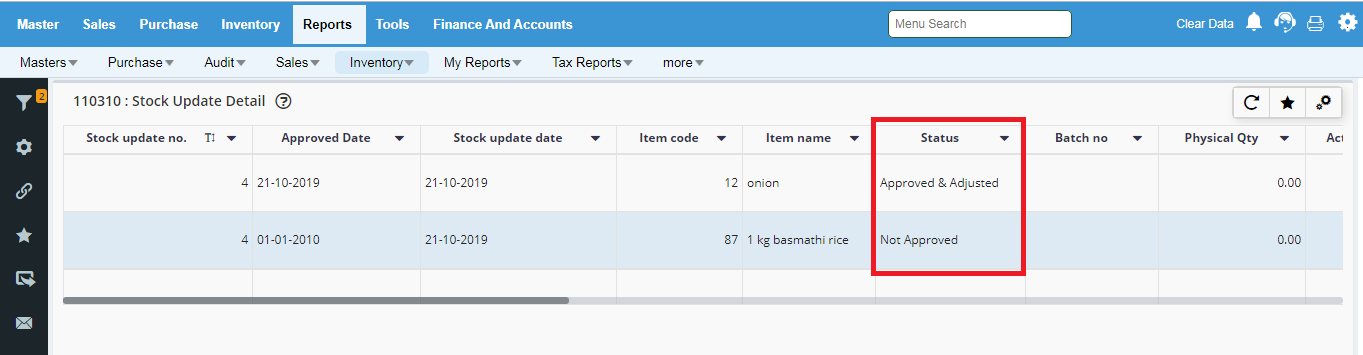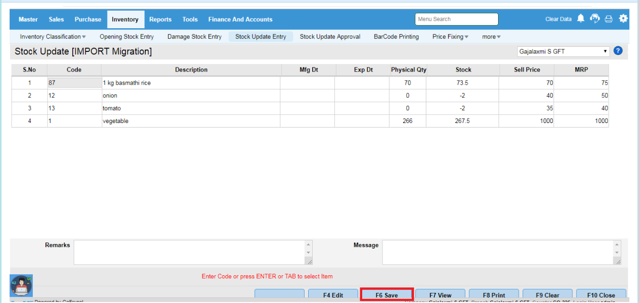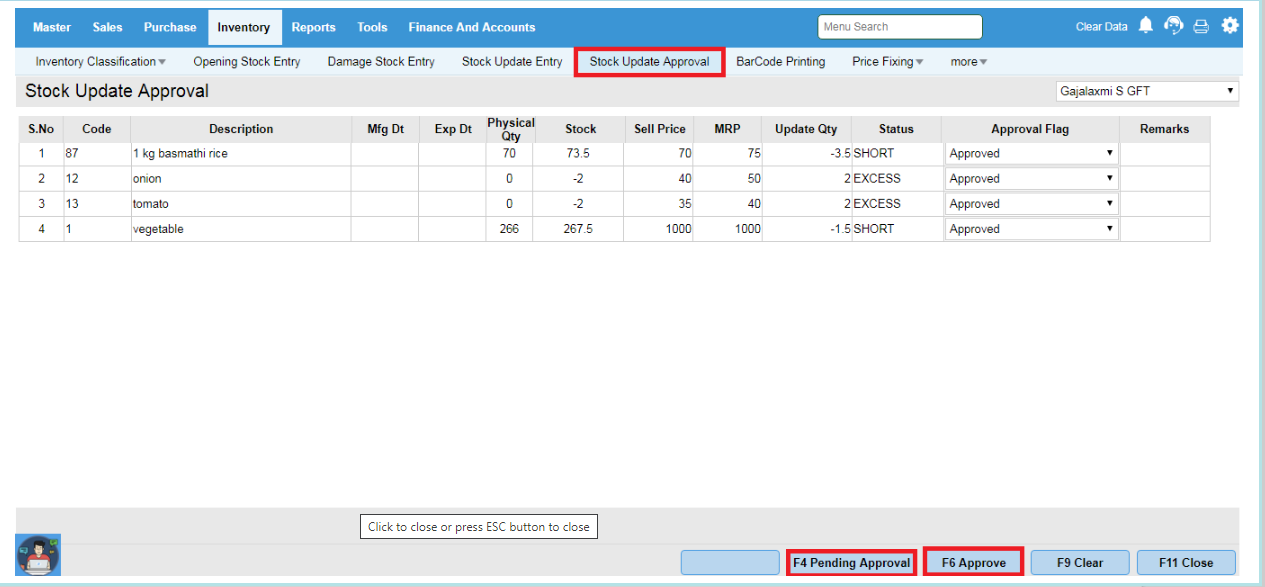 Step 8 : Go to Inventory->Stock Update Approval. Click on F4 Pending Approval then click on F6 Approve.
