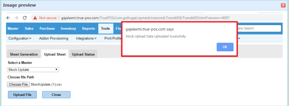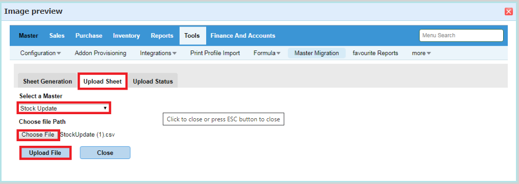 Step 3: To upload the sheet, Click on Upload Sheet and select "Stock Update" then browse the file and click on Upload file