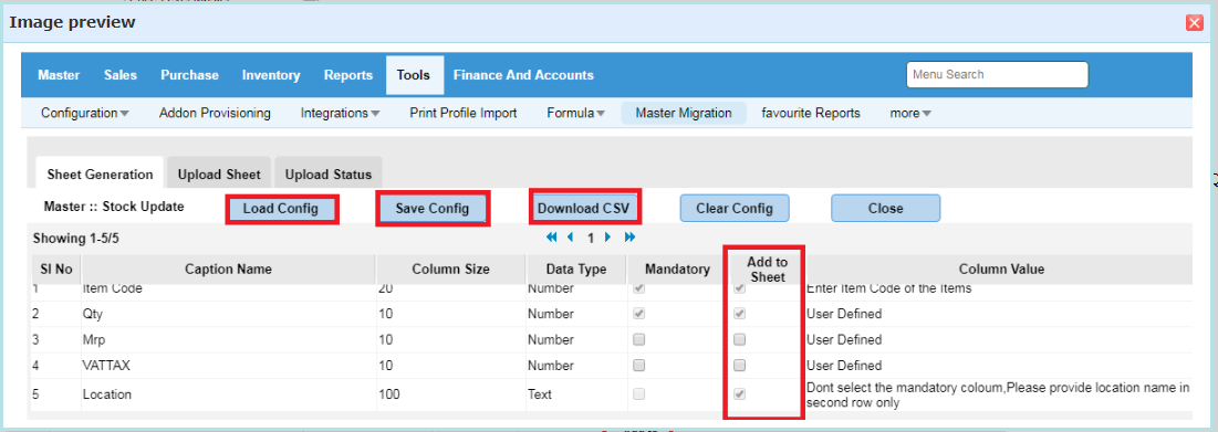 Step 2: Click on Load Config and enable the field to be added in sheet and Click on Save Config and Download the CSV. A sheet will be downloaded. Fill up the sheet with item code and Qty to be updated and other details and save the sheet.