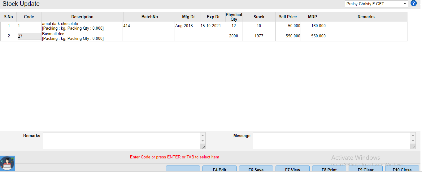 Press F7 to view the previously done stock update entries.