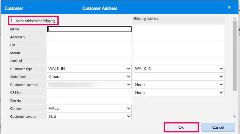 Step 2: If the Customer's address and the shipping address are the same, tick the check box-Same Address for Shipping, RetailEasy on-cloud automatically saves the address as the shipping address. Else, proceed without ticking the check box and enter the shipping address manually.