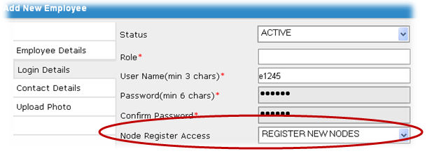 The Employee with the Node Register Access set to Register New Node can only Register a New Node/counter