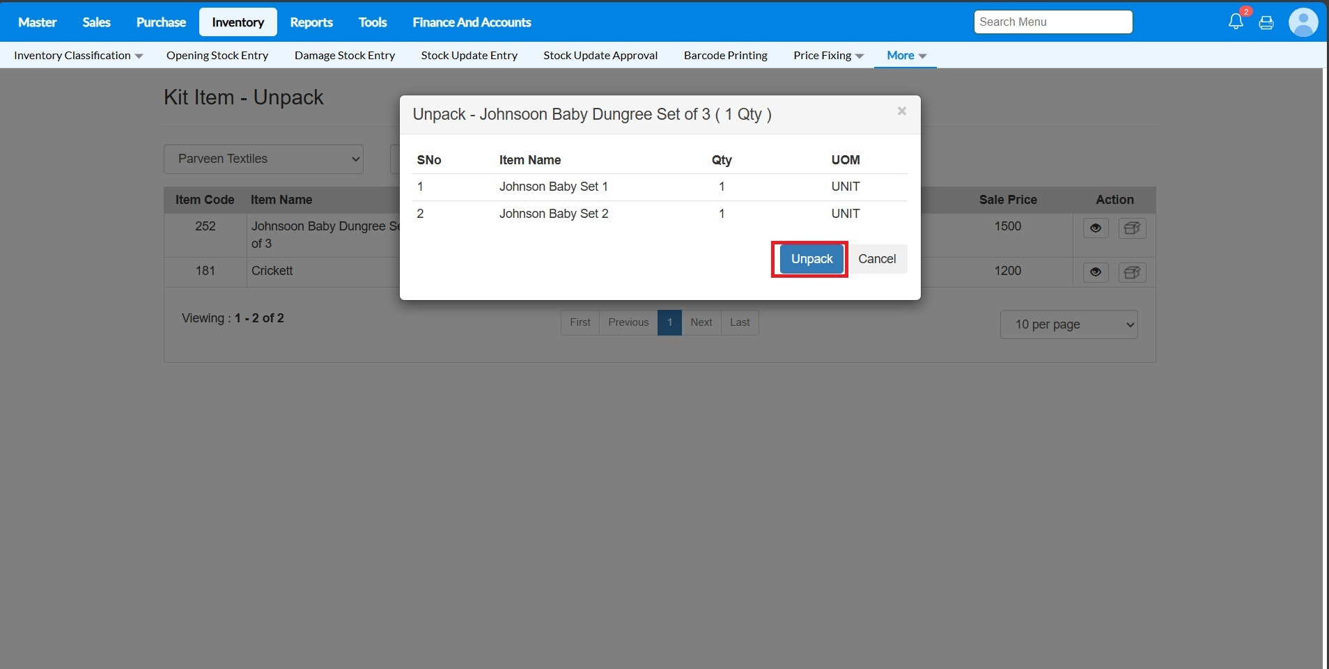 5 - A confirmation Pop up message will appear, which will list out the ingredients involved in preparing the kit item. In order to confirm unpack, click on UNPACK. The kit item will be unpacked successfully.