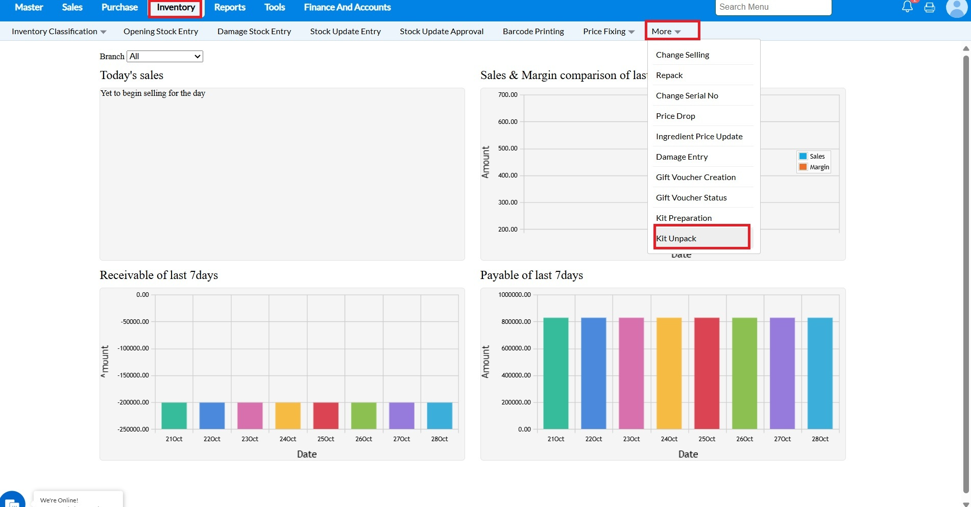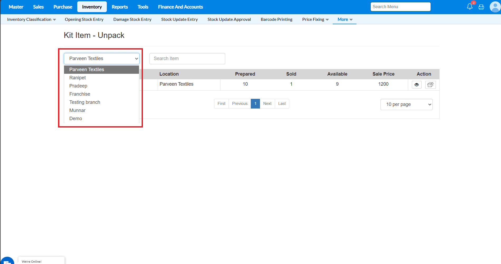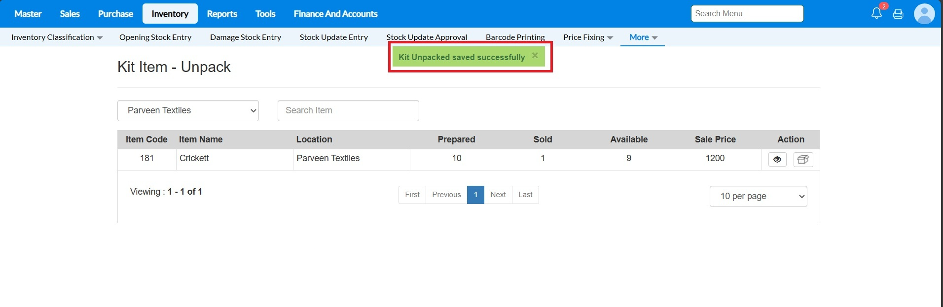 1 - Go To Inventory -> More -> Kit Unpack