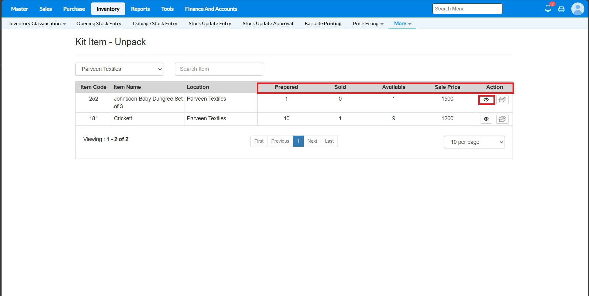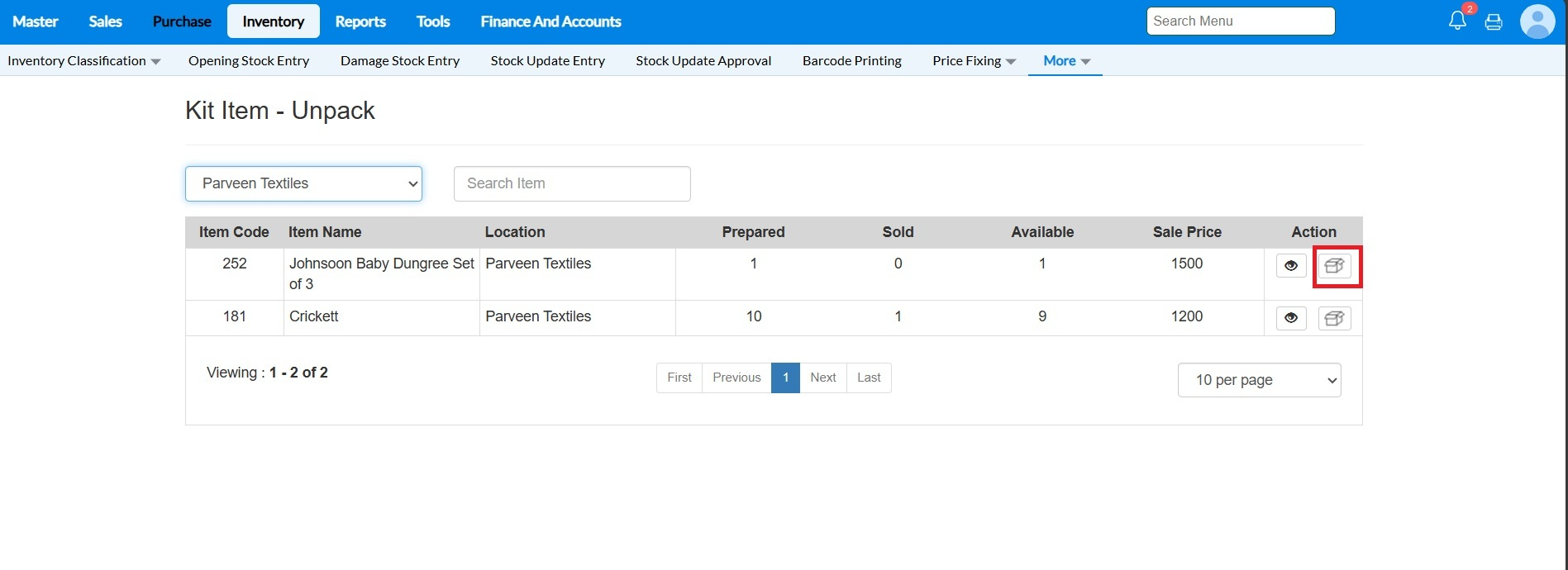 4 - Under the action column, there will be a small box icon, against each item. For whichever kit item need to be unpacked, click on the box icon.