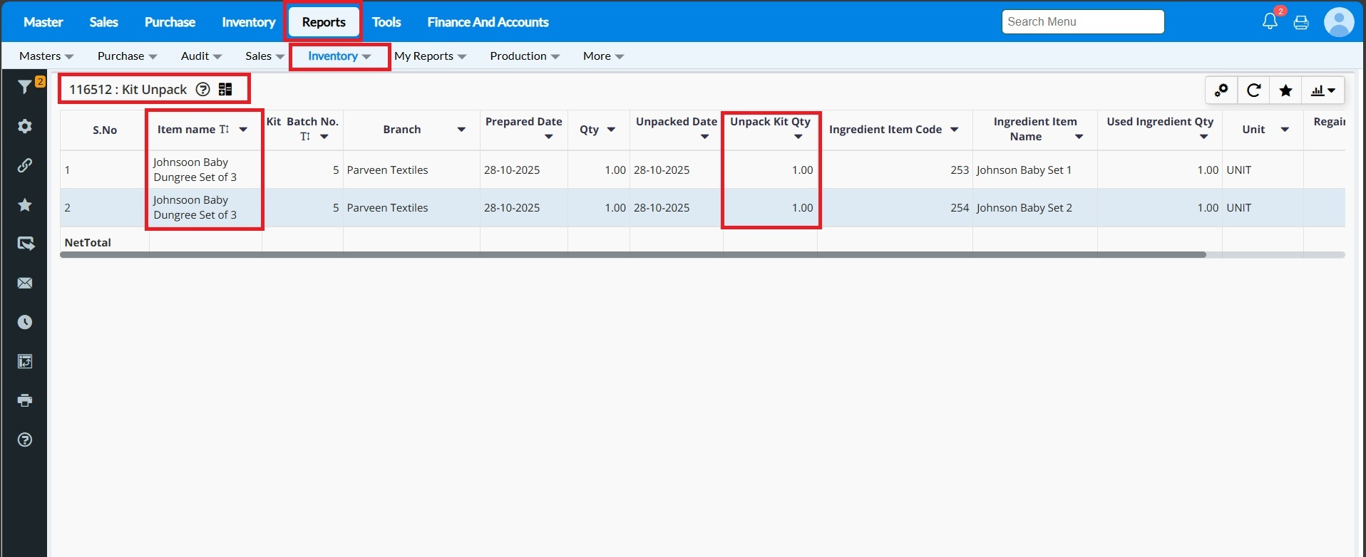 Purpose - Kit unpack is used to revert back the prepared kit item. If we feel like the Kit item is not of use, and to revert back the stock of the ingredient item, the kit can be unpacked. Kit unpack I also used when you have packed extra kit item by mistake.