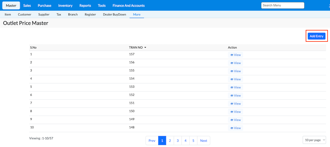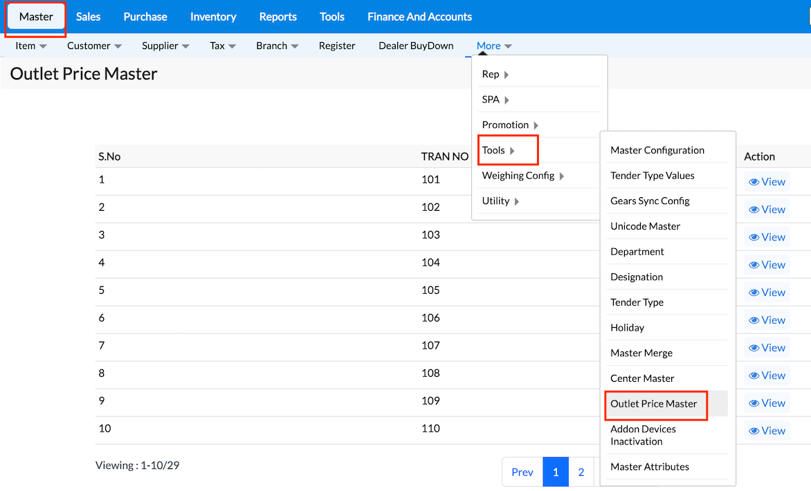 1. From main dashboard, Navigate to Master → More → Tools → Outlet Price Master.