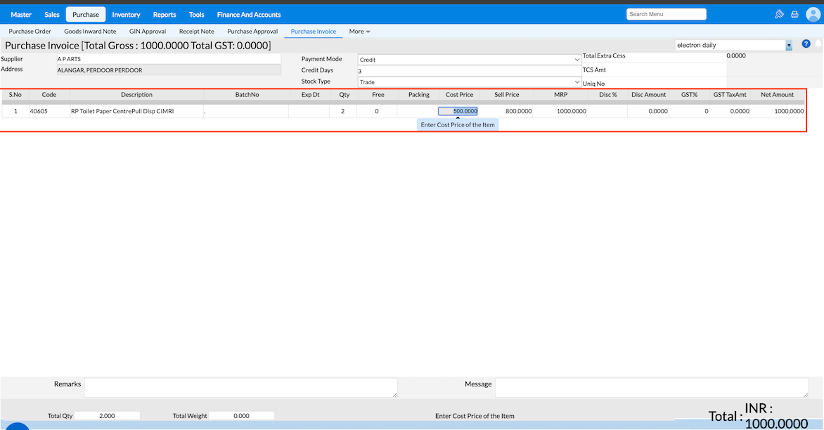 7. Now, you can verify the updated price details in the purchase Invoice screen.